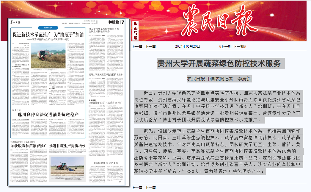 近日,贵州大学绿色农药全国重点实验室教授、国家大宗蔬菜产业技术体系岗位专家、贵州省蔬菜绿色防控与质量安全小分队负责人陈卓依托贵州省蔬菜健康菜园创建行动方案,在务川中等职业学校开设“新农人”培训班。并在务川县黄都镇、遵义市播州区龙坪镇等地建设一批贵州省健康菜园,带领贵州大学“干净优质黔菜”博士村长团队开展蔬菜绿色防控技术示范推广。 据悉,该团队示范了蔬菜全生育期协同控害增效技术体系,包括菜园间套作万寿菊、向日葵、三叶草等生态调控技术、蔬菜病虫害精准用药技术、蔬菜农药残留快速检测技术。针对西南高山蔬菜特点,团队研发了豇豆、生菜、番茄、黄瓜、豌豆尖、菠菜、芫荽、茼蒿等蔬菜全生育期协同控害增效技术体系10余项,出版《十字花科、豆类、茄果类蔬菜病虫害精准用药》丛书。定期发布西部地区乡村振兴“新农人”培训计划,培养返乡创业致富带头人、涉农专业的高校和中职院校学生等“新农人”320人,着力服务地方特色优势产业。 |