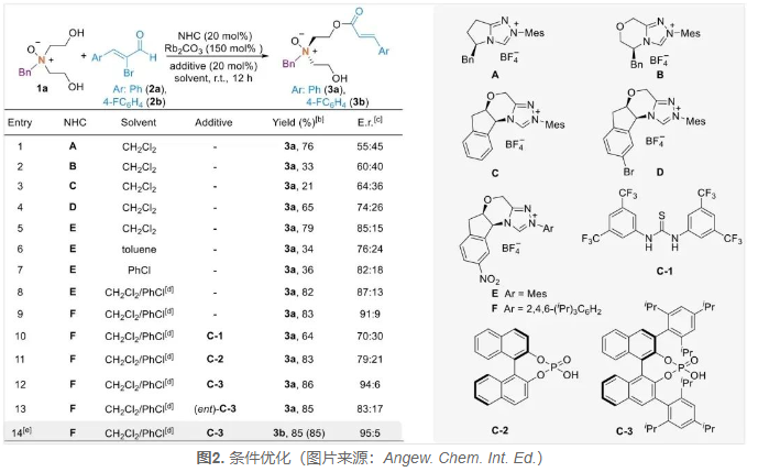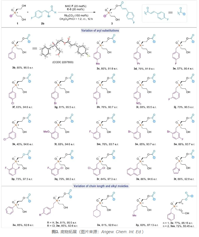 首先,作者以氮氧化物二醇1a和溴代肉桂醛2a为模型底物进行条件优化(图2)。他们首先尝试了多种手性NHC催化剂A-E对控制手性二醇1a的N-立体中心的能力。结果显示,催化剂E在产率和对映选择性方面表现出较好的效果(79%,85:15 er,entry 5)。随后作者对反应溶剂进行了筛选,发现使用CH2Cl2-PhCl混合溶剂可稍微提高产率和选择性(82%,87:13 er,entry 8)。接着,作者尝试使用催化剂F,进一步提高了对映选择性至91:9 er(entry 9 vs entry 8)。在尝试了多种氢键给体和Brønsted酸后,作者确定手性磷酸C-3作为有效的协同催化剂,产物3a的产率和对映选择性显著提高(entry 12,86%,94:6 er)。作者还发现手性Brønsted酸C-3的构型对产物的对映选择性控制起着关键作用。最后,通过使用对氟溴代肉桂醛2b作为底物,作者顺利地得到了高产率和优异对映选择性的产物3b(85%,95:5 er,entry 14)。