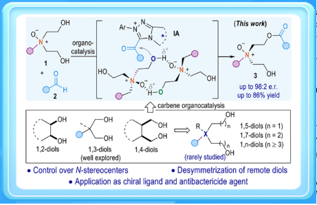 池永贵教授团队专注于在有机合成和绿色药物农药研发生产领域展开创新性工作。近日,池永贵教授团队伍星星利用N-杂环卡宾(NHC)催化氮氧二醇(1,5-或1,7-二醇)去对称化策略,成功开发了一种氮中心手性化合物的催化调控新方法(图1C)。值得一提的是,尽管对映选择性的二醇去对称化反应已经取得了广泛的研究,但大部分方法主要集中在具有1,2-、1,3-和1,4-二醇的对映选择性转换上。针对链长较长(例如1,5-或1,7-二醇)二醇底物的催化去对称化反应仍然是一个巨大的挑战,其原因可能是由于远程二醇的构象灵活以及与手性中心相距较长等因素。在该方法中,作者发现氮氧化物由于存在一类特殊的离子型氢键,在反应溶液中主要以二聚体的形式存在,继而通过手性NHC结合的酰基唑鎓中间体对底物二聚体进行高效的去对称化,获得了一系列高产率、高对映选择性、具有手性四面体结构的氮氧化物,解决了氮立体中心化合物对映选择性合成中所面临的长期挑战。与此同时,所制备的手性N(V)-氧化物可以作为催化剂实现一系列的不对称催化反应,并发现其具有一定的抗菌活性,这对发掘绿色农药活性先导结构具有潜在意义。