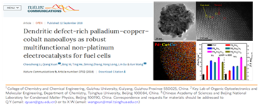 最近,我校化学与化工学院2016级硕士研究生李朝忠以第一作者在国际顶级综合性期刊《自然·通讯》(Nature Communications)上发表Dendritic defect-rich palladium- copper- cobalt nanoalloys as robust multifunctional non-platinum electrocatalysts for fuel cells 论文,影响因子IF=12.353,(https://www.nature.com/articles/s41467-018-06043-1),同时,在国际期刊Nanoscales(一区,IF=7.233)上第一作者在发表1篇论文。导师是我校袁强教授。