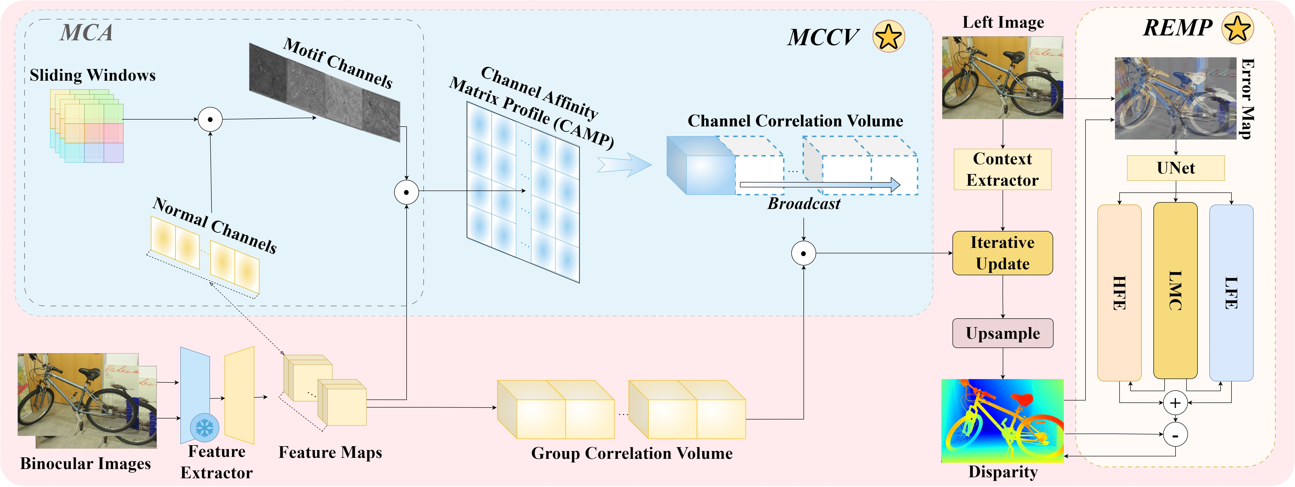 在双目立体匹配领域,CroCo-Stereo和GANet等基于深度学习的立体匹配技术已经取得了重大进展。然而,现有方法在生成特征通道的过程中不可避免地会丢失几何结构信息,导致边缘细节不匹配。本文提出Motif Channel Correlation Volume (MCCV),通过将捕捉特征通道中重复出现的模式,并将这种模式重新投影到特征图和成本体积上,实现更精确的双目图像边缘细节的匹配代价计算。为了进一步细化几何纹理的匹配,本文提出REMP模块,结合重建误差和高低频特征中重复出现的模式,惩罚全分辨率视差的错误计算。以上范式构成了MoCha-Stereo网络,实验表明,MoCha-Stereo修复了特征通道中丢失的细节,大大提升了算法对边缘纹理结构的匹配能力。