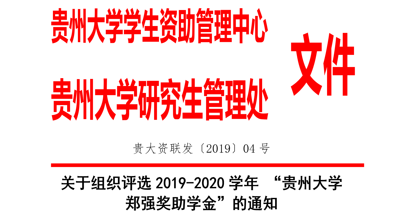 为进一步推动贵州大学的教育事业,鼓励在校生勤奋学习、刻苦钻研、积极参加科技创新活动,根据《贵州大学郑强奖助学基金管理办法》和2019年贵州大学教育发展基金会提供的“郑强奖助学金”评选方案,现将2019-2020学年评选“贵州大学郑强奖(助)学金”有关评选事宜通知如下:
