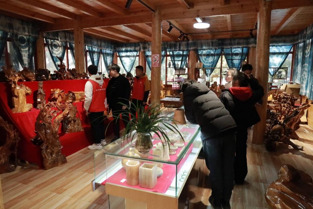 为了发展旅游业,登鲁村还修建了环楠木林步行道,既方便游客观赏又保护树木成长。探访过程中,团队成员还参观了村里的金丝楠木博物馆。馆内陈列着大量的树雕、木梳、手串等楠木工艺品,这些精美的工艺品不仅满足了游客的购买需求,也成为了登鲁村“楠韵”的一大旅游特色。