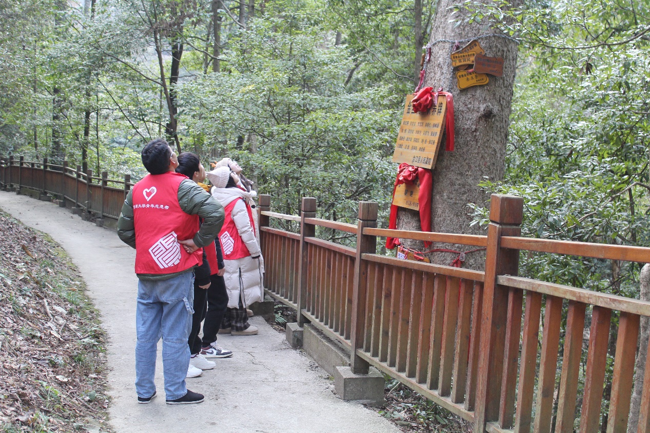 (成员参观金丝楠木林和保护牌)