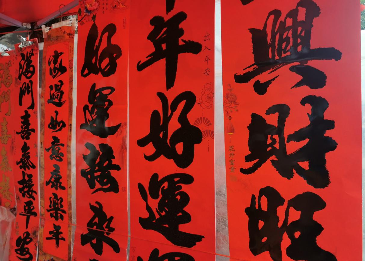 饱蘸浓墨的毛笔,在红纸上书写出寓意吉祥的春联。