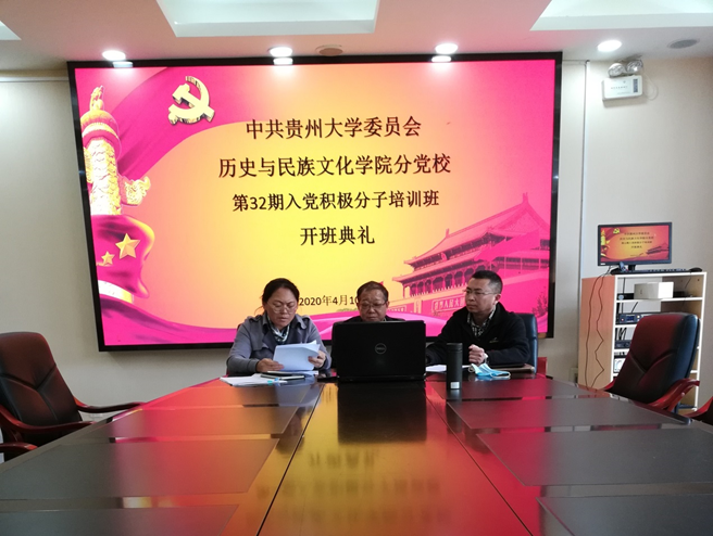 2020年4月10日,中共贵州大学委员会历史与民族文化学院分党校第三十二期入党积极分子培训班举行了开班仪式。受疫情影响,此次开班仪式通过“腾讯会议”举行。会议由学院组织员张月主持,院党委书记杨军昌、副书记雷方俊及学院21名入党积极分子通过网络视频参加本次开班典礼。