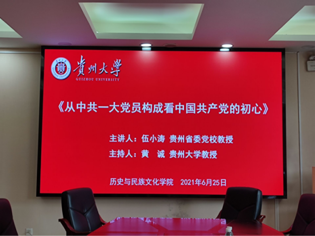 为推进党史学习教育开展,进一步引领我院学生深入学习党史,从党的奋斗历史中汲取“红色力量”,2021年6月25日,由历史与民族文化学院主办,东方思想与文化遗产研究中心、历史学本科生党支部承办、江苏宏德文化出版基金会协办的“红色之音”主题讲座在院201会议室开展,特邀贵州省委党校伍小涛教授以《从中共一大党员构成看中国共产党的初心》为题做交流分享,学院黄诚教授主持,学院师生党员及积极分子60余人现场聆听了讲座。