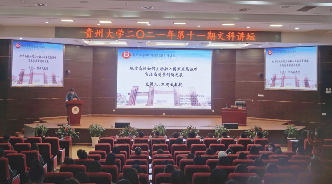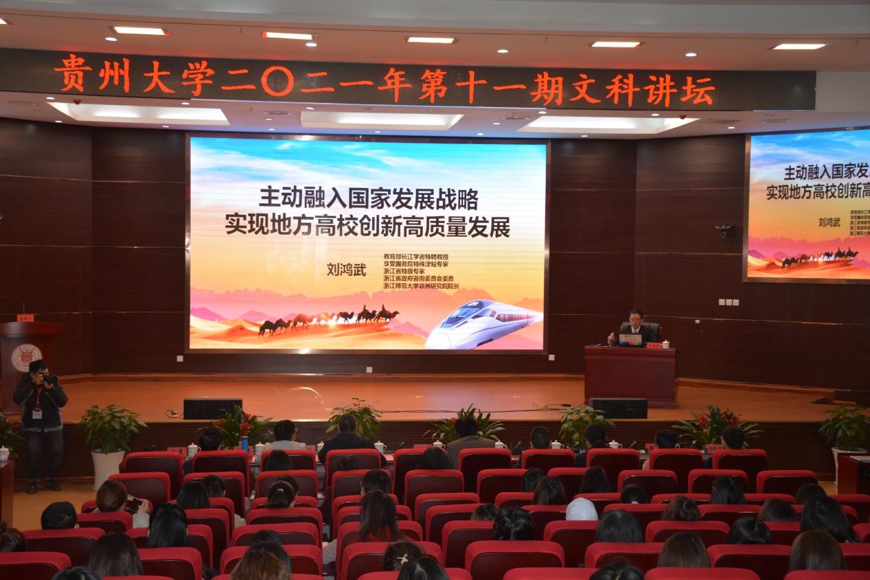 2021年4月9日上午9点半,由贵州大学哲学社会科学研究院主办,外国语学院、公共管理学院、马克思主义学院承办的贵州大学2021年第11期文科讲坛在贤正楼报告厅举行。本次讲坛特邀浙江师范大学非洲研究院院长刘鸿武教授作题为“主动融入国家发展战略,实现地方高校创新高质量发展”的学术讲座。