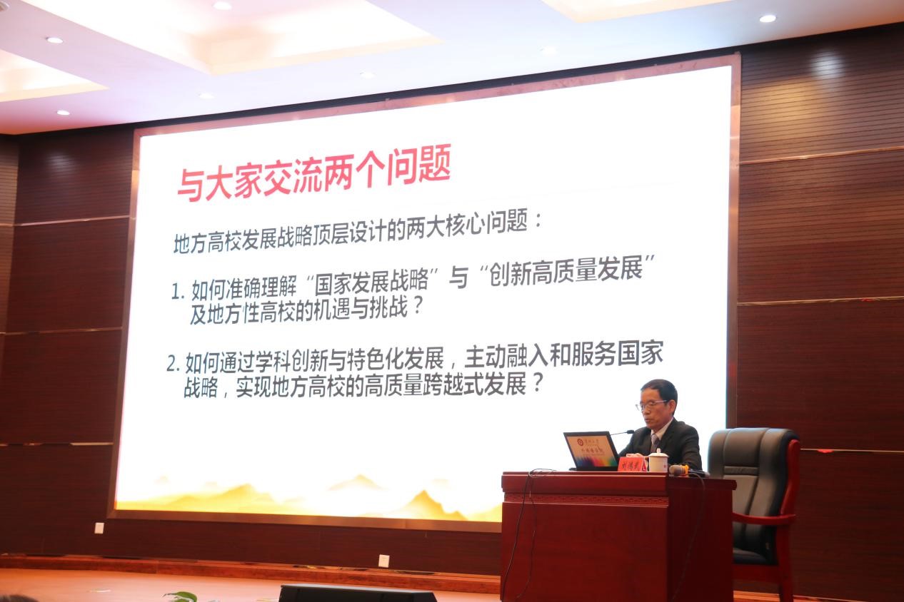 刘教授对地方高校发展战略顶层设计的两大核心问题进行了阐述。对于如何准确理解“国家发展战略”与“创新高质量发展”及地方性高校的机遇与挑战。刘教授提到,在“一带一路”国际合作高峰论坛中习近平总书记强调:万物得其本者生,百事得其道者成。地方性高校只有搭乘国家快速发展的列车,自我创新、把握时代机遇。在谈到如何通过学科创新与特色化发展,主动融入和服务国家战略,实现地方高校的高质量跨越式发展方面,刘教授从学科形成与演进的规律开始,谈到学科应“分科而治”与“整体而立”相结合;中国高校学科设置应与国家体系挂钩;从而在时间上做到“论从史出”、空间上做到“史地结合”。唯有加快创新学科发展,融入国家发展战略,方能打造人类共建、共通、共享的知识体系以及思想理念与行动智慧。