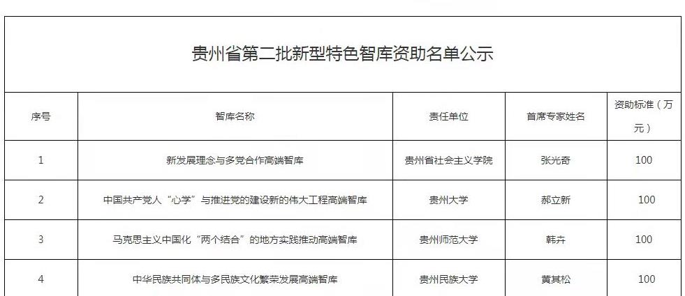 经中共贵州省委宣传部部务会研究决定,现将我省第二批新型特色智库资助名单予以公示。公示时间为2021年11月17日至11月23日。公示期内,如有异议,请以书面方式向我们反映。提出异议者须提供本人真实姓名、工作单位、联系电话等有效联系方式,我们将予以严格保密。凡匿名、冒名或超出期限的异议不予受理。