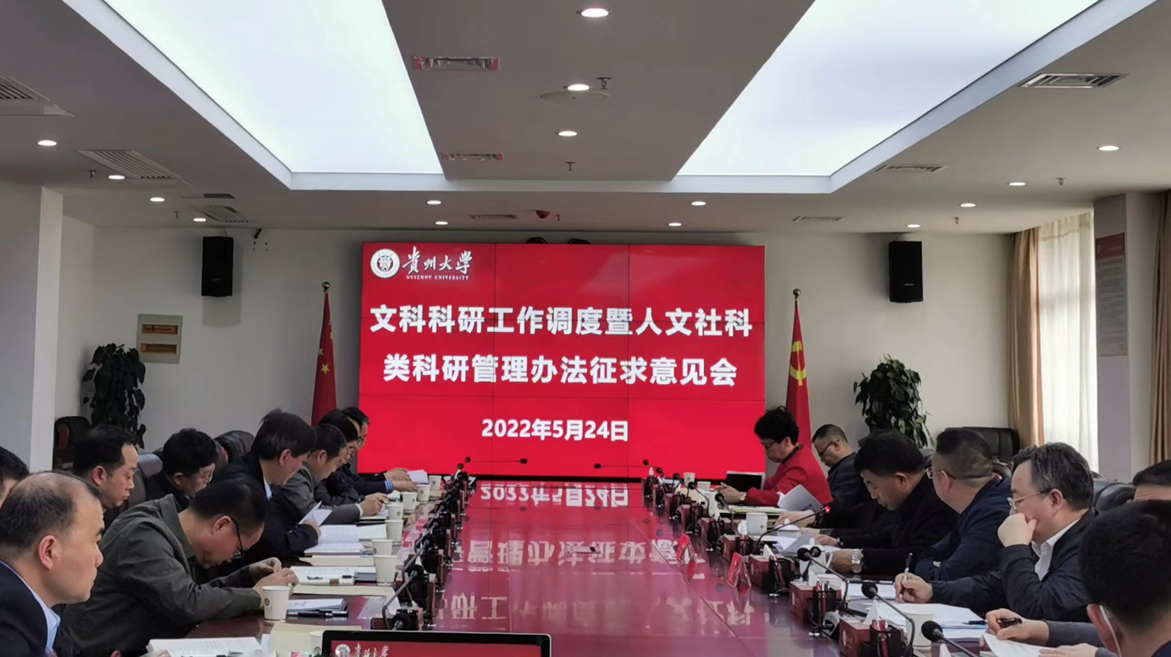 5月24日下午,贵州大学文科科研工作调度暨人文社科类科研管理办法意见征求会在贤政楼311会议室召开。校党委副书记骆长江、副校长漆思出席会议,党委宣传部、哲学社会科学研究院、各文科学院、科研机构主要负责人参加,会议由副校长漆思主持。