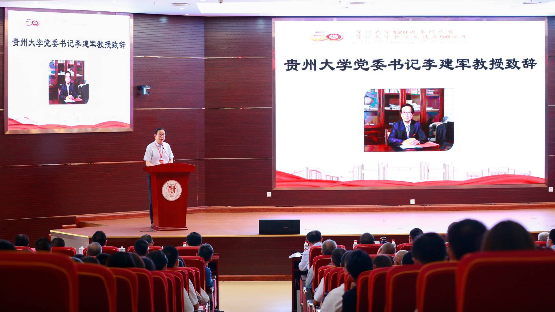 贵州大学党委书记李建军致辞。他指出,贵州大学哲学系在半个世纪的办学历程中为社会各界培养和输送了大量优秀人才,为国家和地方经济社会发展作出了积极贡献。他代表学校向老一辈哲学系教师表达衷心的感谢和崇高的敬意,并表示,哲学系的一代代同仁将不忘初心、砥砺前行,努力创造哲学系更璀璨美好的明天。李建军希望莅临本次庆典的专家和学者畅所欲言,共同探讨哲学教育的前景与未来;希望贵大哲学系的优秀校友们继续关心支持学校的发展,发动和带领更多的校友共同为“做强贵州大学”作贡献;希望哲学学院的全体同仁以建系五十周年为新起点,同心同德、接续奋斗,以奋进的姿态书写贵大哲学系教育高质量事业发展的新篇章!