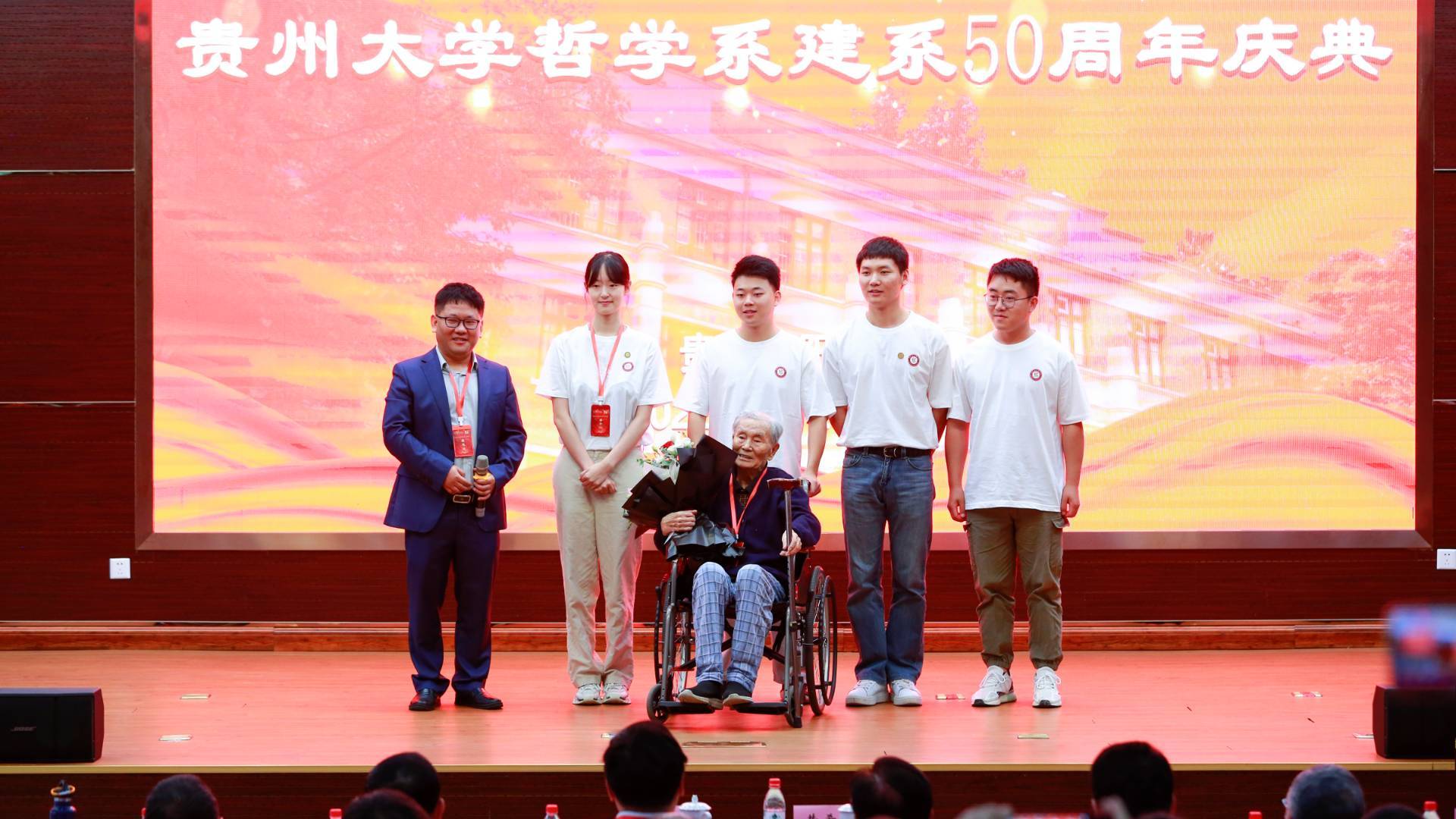 学生代表向贵州大学哲学系元老、贵州大学原副校长、哲学系原主任黄希贤教授敬献鲜花。