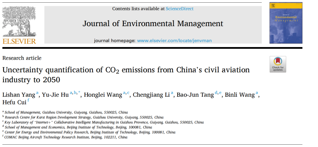 2023年6月9日,我校管理学院副教授胡玉杰老师及其指导的2021级研究生杨莉杉,围绕双碳背景下的中国民航业碳减排路径研究取得阶段性进展,研究成果《Uncertainty quantification of CO2 emissions from China’s civil aviation industry to 2050》在国际权威期刊《Journal of Environmental Management》上在线发表,贵州大学为第一署名单位。这是贵州省致力于民航业双碳研究领域的首篇高质量高水平论文。