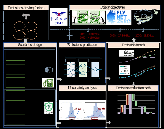 本研究采用德尔菲法围绕“飞机制造商—航空公司—机场”三方专家多轮调查确定民航业碳排放的关键影响因素,并设定多种发展情景,构建反向传播神经网络与蒙特卡洛模拟模型对中国民航业碳排放路径进行不确定性量化。研究结果表明,中国民航业可以有效帮助中国实现碳达峰和碳中和目标,但是为了实现全球民航业的净零碳排放目标,中国需要在最佳排放情景基础上减少约82%至91%的排放量。因此,在国际净零排放目标下,中国民航业面临较大减排压力。使用可持续航空燃料是到2050年减少航空碳排放的最佳途径。除了应用可持续航空燃料外,还需要开发新一代飞机,引入新材料和升级发动机技术,实施额外的碳吸收措施,并利用碳交易市场,促进中国民航业为减缓气候变化做出贡献(Graphic Abstract如下图所示)。