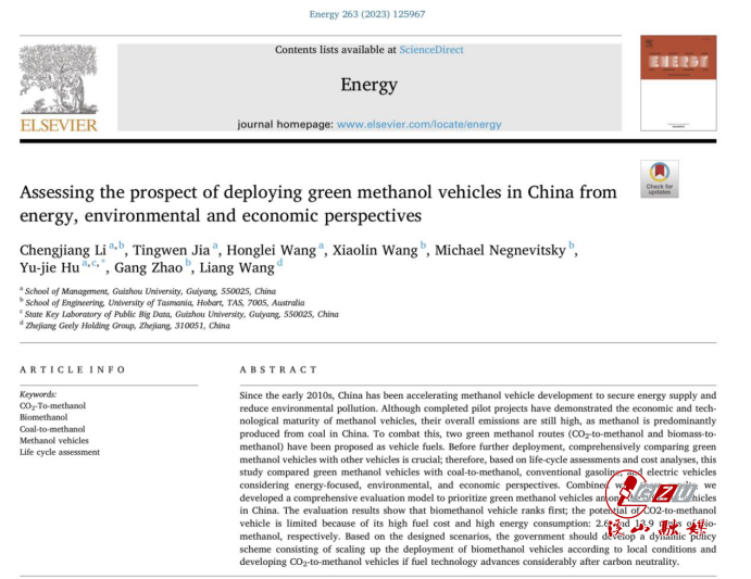 我校管理学院特聘C岗教授李澄江近期在能源领域国际顶级期刊《能源》(SCI中科院一区顶刊)发表文章“Assessing the prospect of deploying green methanol vehicles in China from energy, environmental and economic perspectives”。