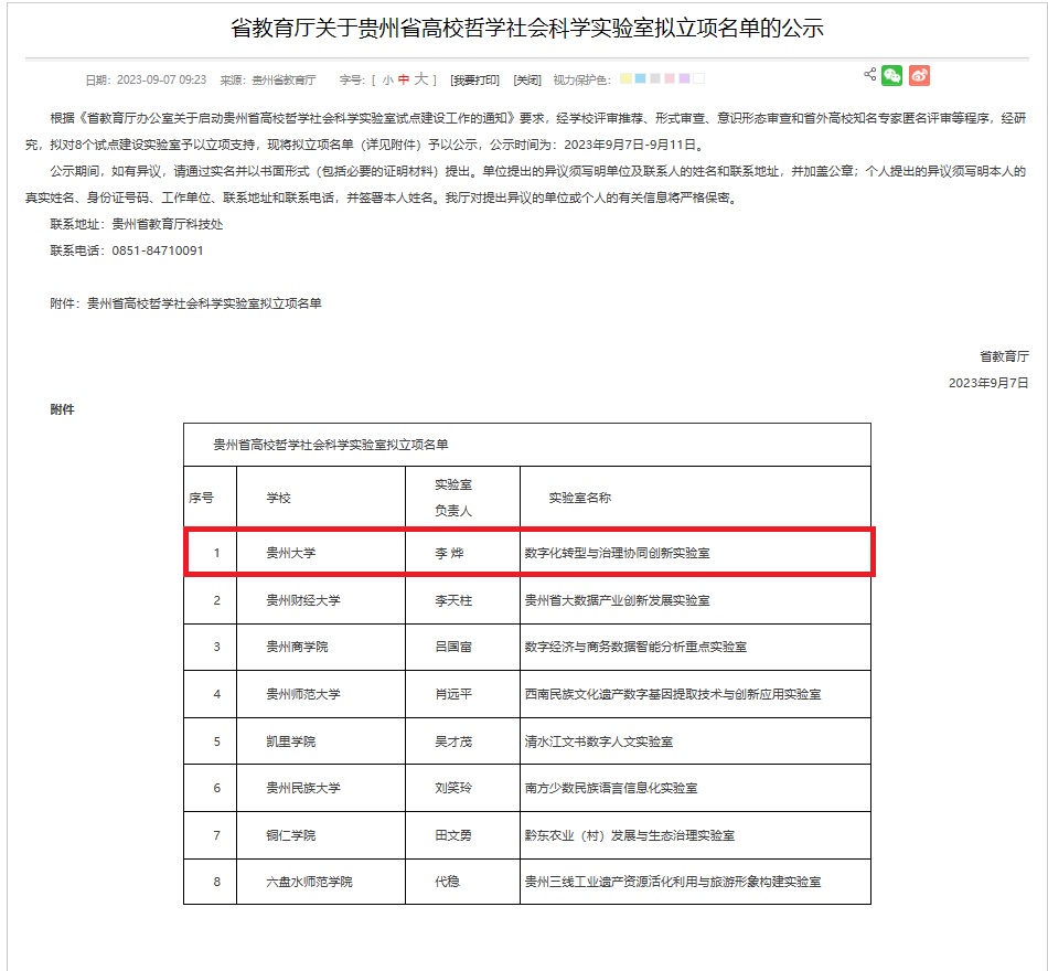根据省教育厅9月7日发布的信息,我校李烨教授团队申报的“数字化转型与治理协同创新实验室”获贵州省高校哲学社会科学实验室试点建设立项公示。