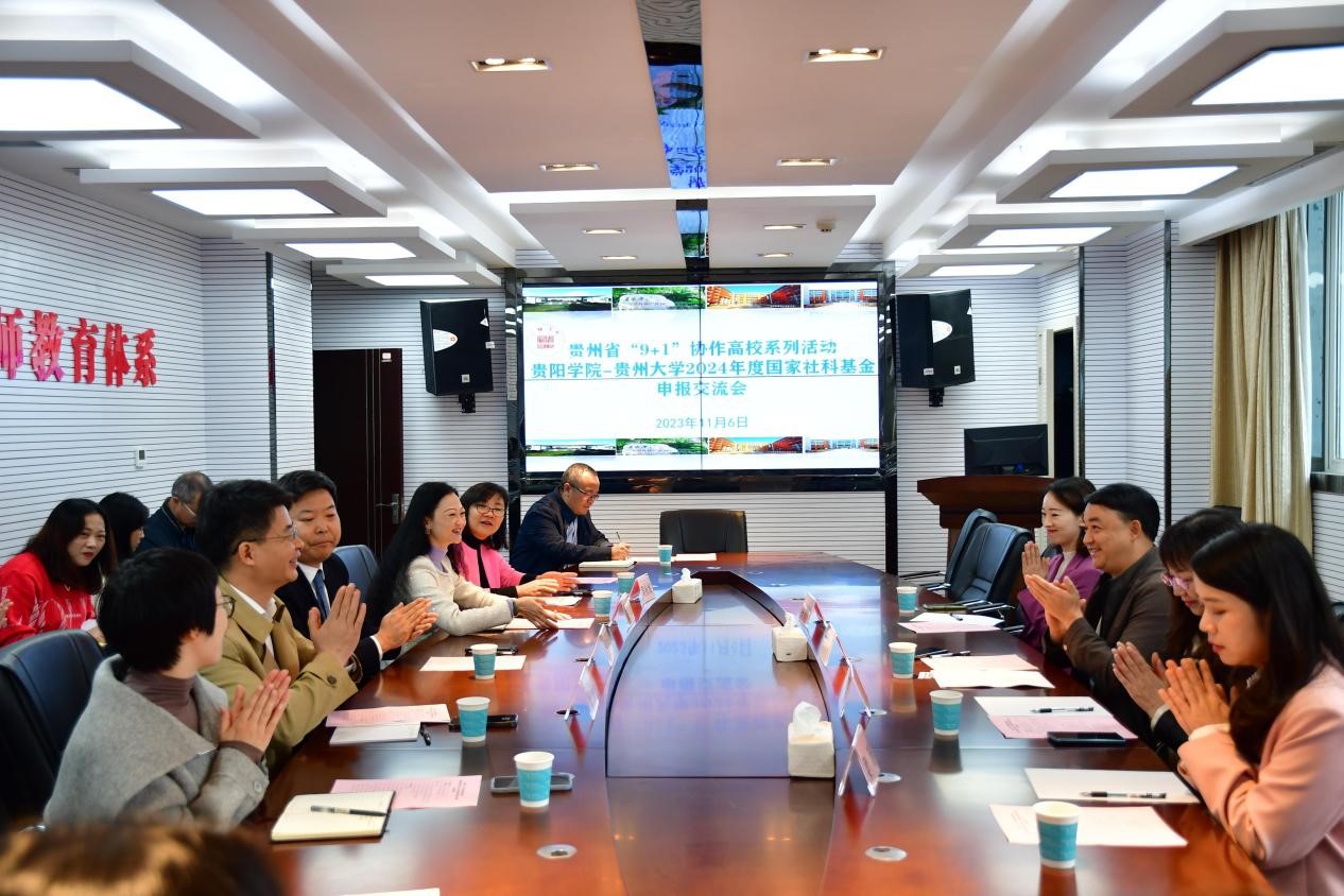 2023年11月6日上午,贵州省“9+1”协作高校系列活动:贵阳学院-贵州大学2024年度国家社科基金申报交流会在贵阳学院九思楼四楼会议室举行。贵州大学人文社科处副处长周乐欣、项目科科长肖贵秀、成果科科长梁瑶以及项目科副科长李倩倩赴贵阳学院开展工作交流。贵阳学院党委委员、副校长张加万出席会议,科研处副处长文娟,经管学院党委书记张韬,经管学院党委副书记黄咏梅以及科研处、经管学院相关博士、教授、工作人员参会。会议由文娟主持。