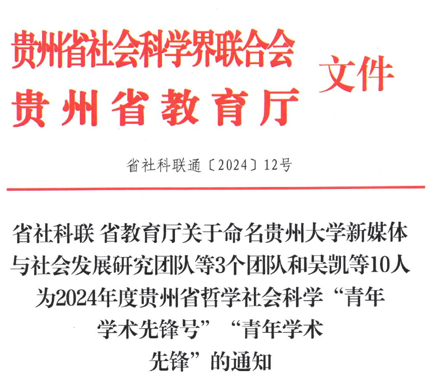 近日,贵州省社科联公布了2024年贵州省哲学社会科学“创新团队”“青年学术先锋号”“青年学术先锋”名单。我校哲学学院张连顺教授带领的贵州大学量论因明学及文化价值研究省创新团队、哲学学院龚晓康教授带领的贵州大学阳明文化转化运用研究省创新团队被授予“2024年度贵州省哲学社会科学创新团队”。我校传媒学院杨逐原教授带领的贵州大学新媒体与社会发展研究团队被授予2024年度“青年学术先锋号”。我校马克思主义学院吴凯副教授、马克思主义学院杨正军副教授被授予2024年度“青年学术先锋”。