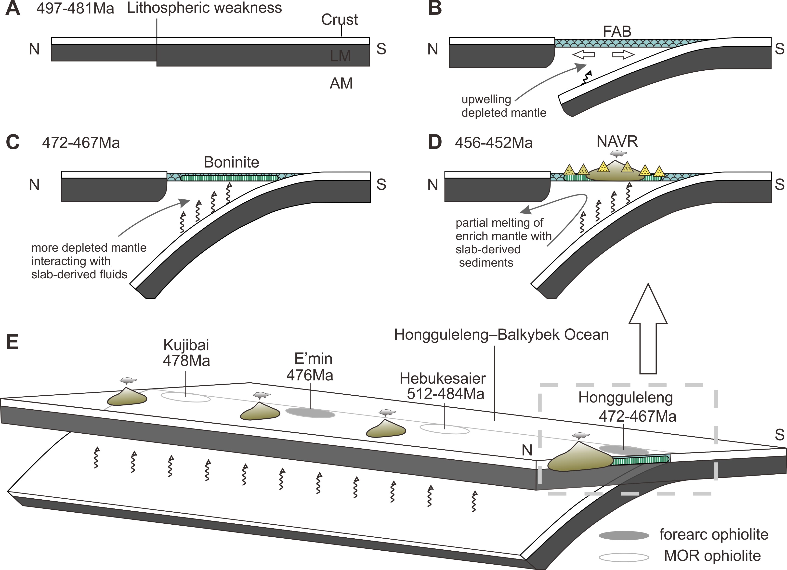 初始俯冲作为威尔逊循环的关键一步,被视为一个洋陆转换开始的标志。然而,初始俯冲期间的壳幔相互作用和地壳生长过程仍旧是神秘的。近期,贵州大学特聘教授杨亚琦(第一作者)联合中国地质科学院地质研究所赵磊研究员(通讯作者)、张进研究员等,在西南中国的西准噶尔洪古勒楞蛇绿岩杂岩体中识别出了一套包括三个岩石组合的相对完整的岩浆岩序列。第一组岩石组合由典型的洋中脊源的岩石组成,包括:深海橄榄岩、辉长岩、斜长花岗岩和玄武岩;第二组岩石组合主要含有弧前玄武岩和玻安质的辉长岩,它们具有高的大陆指数(CI > 130),与马里亚纳原弧岩石组合相似;第三组岩石组合由钙碱性安山岩和弧拉斑玄武安山岩组成,它们具有中等的大陆指数(50 < CI < 100),指示它们形成在一个转换的大洋岛弧环境。锆石U-Pb年龄结果显示N-MORB辉长岩和斜长花岗岩侵位于483-481 Ma,玻安质岩石,钙碱性安山岩和弧拉斑玄武安山岩分别有472-467Ma,456Ma和452Ma的结晶年龄。第一组到第二组岩石组合显示出Ba/Th和V/Ti增加的趋势,指示初始俯冲期间地幔中含水流体的加入和氧化性的增加。然而,第二组到第三组岩石组合显示出了Th/Nb和(La/Sm)cn的增长但是Ba/Th的降低,指示着大洋弧演化过程中板缘沉积物的贡献明显。结合区域地质资料,我们考虑在中寒武世-奥陶纪期间,古亚洲洋发育了一个跨越西准噶尔北部和东哈萨克斯坦的近东西向的次级洋盆。西准噶尔北部的洋中脊型和弧前型蛇绿岩以及我们的结果指示了这个次级洋盆约在512-478Ma发生了洋脊扩张,约在476-467Ma发生了初始俯冲,而约456-452Ma期间发育一个相对成熟的洋内弧。