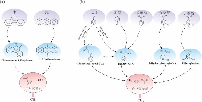 图2 (a)微生物有氧降解;(b)微生物无氧降解PAHs,生成甲烷(After Kadri et al. 2017; Campbell et al., 2021)