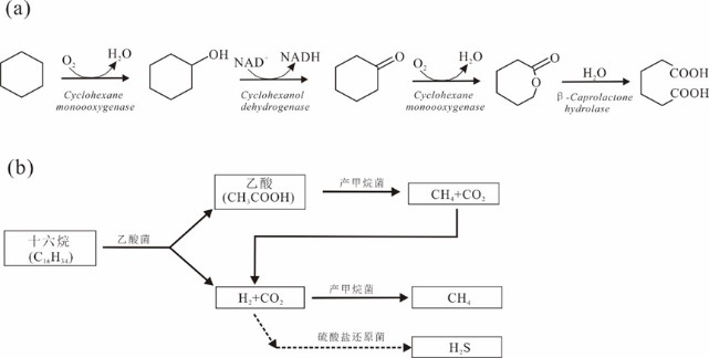 图1 (a)环己烷有氧降解途径;(b)十六烷无氧降解途径(After Peters, 2005)