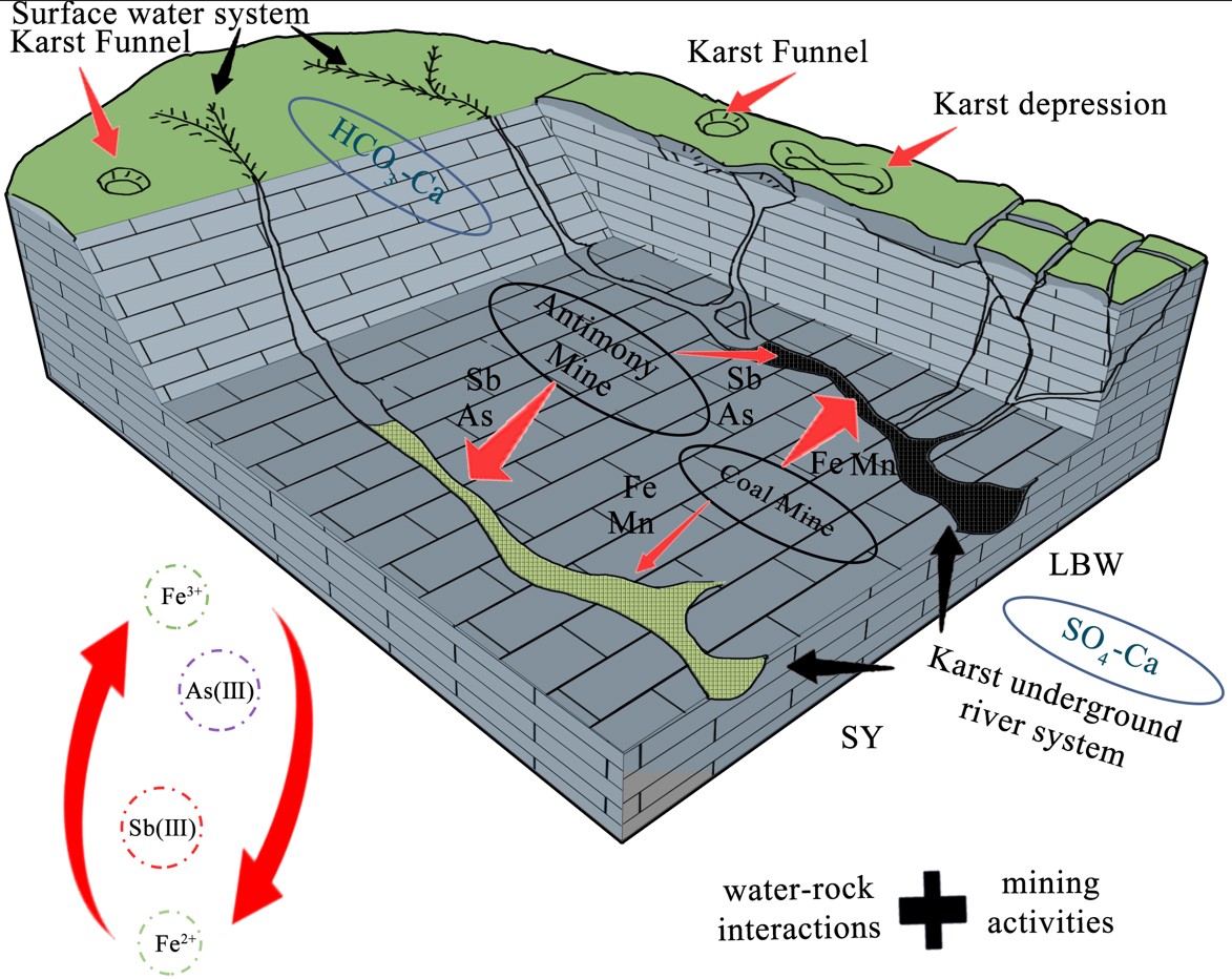 作者还应用主成分分析方法来识别相邻岩溶地下河系统的污染类型,进而揭示复杂矿山活动对岩溶地下河的影响程度,龙摆尾地下河主要受煤矿开采活动(Fe、SO42-)的影响;水鸭地下河则主要受到Sb和Fe的影响,表明受到锑矿堆场污染和周边煤矿开采活动的影响。水文地球化学作用是控制岩溶地下水环境的主要因素。采矿活动影响下的Sb、As的水文地球化学行为示意图如图4。