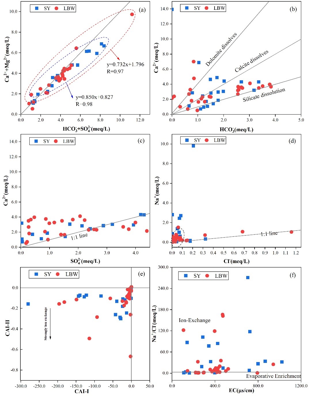 图2 各离子关系图(a) (Ca2++Mg2+)/(HCO3-+SO42-),(b) Ca2+/ HCO3-, (c) Ca2+/ SO42-,