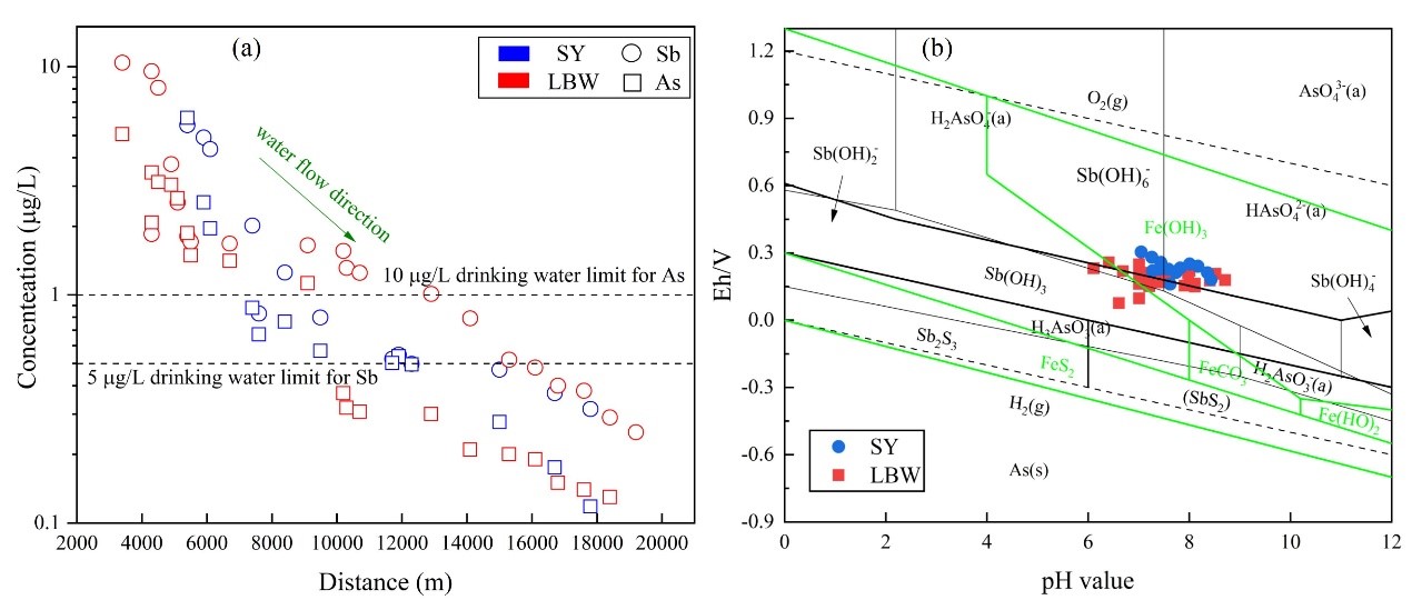 图3 (a) Sb、As与河流距离关系;(b) Sb-S-H2O(粗线)、As-S-H2O(细线)、Fe-S-C-H2O(绿线)在25°C和1bar的Eh-pH图