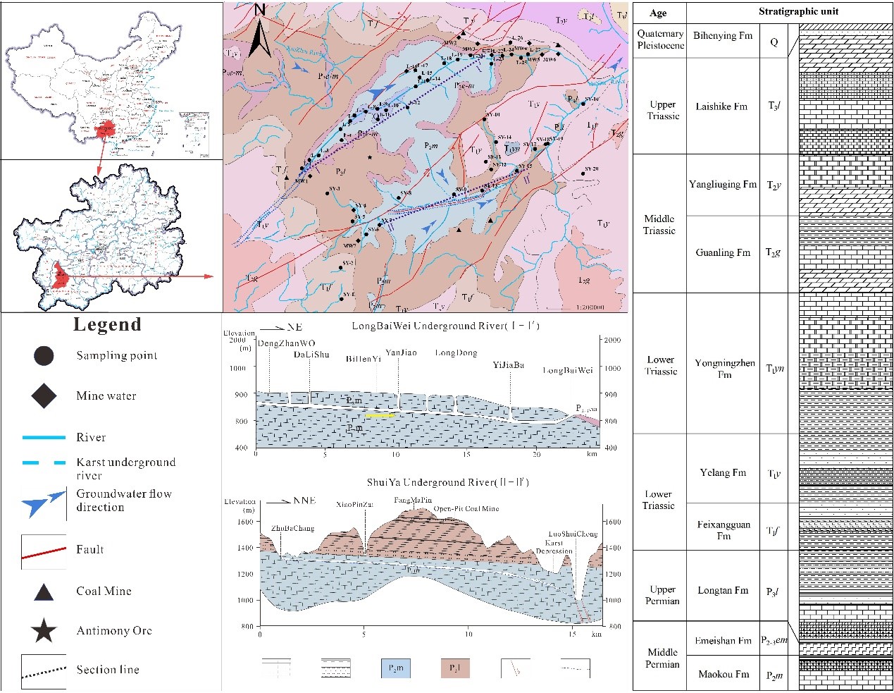 据统计,中国大约有 40%的地下水受到采矿活动和关闭或废弃矿山的影响。对于矿产资源丰富,开采历史悠久的西南地区,在经济快速发展的同时,采矿活动引起了地表及地质环境破坏、矿山废水污染以及重金属污染等问题更为突出。为了能够保证区域经济快速增长与地下水环境保护的协调发展,如何处理矿产资源开发与岩溶地下水资源保护利用的矛盾是目前亟待解决的问题。岩溶地下水是贵州省晴隆县的重要水资源,受地区特殊的地质地理条件影响,该地区岩溶作用强烈,具有典型的岩溶地形地貌,地下溶蚀裂隙和岩溶管网纵横交错,使得该区域煤、锑矿开采产生的固体废物和废水很容易进入并污染岩溶地下河系统。