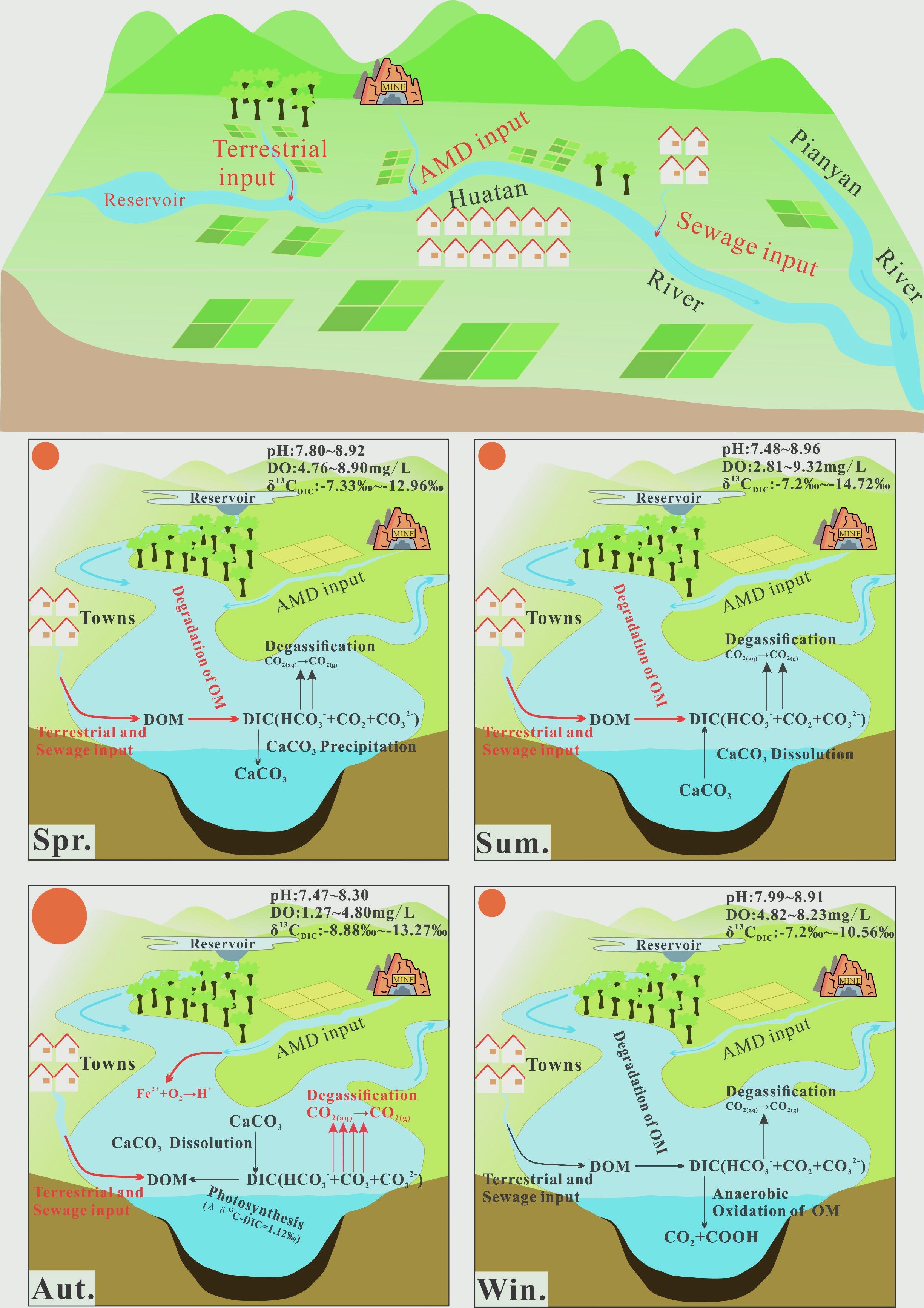 花滩河流域河水pH具有明显的季节变化特征,冬春季节pH低于夏秋季。受AMD驱动,DIC沿水体流动方向逐渐降低,CO2去气造成DIC碳同位素组成显著比常规喀斯特流域水体偏重,全年平均值的变化范围在-6.00‰ ~ -8.78‰。碳酸盐岩溶蚀、有机质矿化和生活污水的输入都不同程度向水体贡献了DIC。