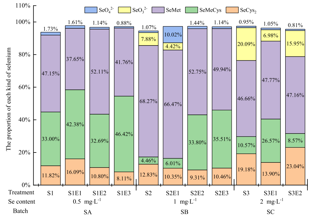 小白菜地上部和地下部总硒含量会随着外源硒浓度或PGPR施用剂量的升高而增加,其中后者对小白菜总硒含量升高的影响更显著。本研究虽然添加的是无机硒(SeO32-),但小白菜可食部位有机硒在总硒中的比例均超过80%,不过,随着硒浓度升高,小白菜可食部位无机硒比例也是逐渐升高的,这说明小白菜转化无机硒为有机硒的能力是有限的。可喜的是,PGPR的施用在某种程度上促进了小白菜体内无机硒向有机硒的转化,尤其是当硒为1 mg L−1时,随着PGPR施用剂量升高,这种转化效率可能更高。此时,小白菜可食部位有机硒比例几乎达到99%,其中具有抗癌功效的有机硒(SeMet和SeMcCys)的比例超过85%,且有更多的SeMet转化为哺乳动物含硒蛋白SeMcCys,更易被人体吸收利用。本研究为PGPR在富硒蔬菜生产提供了数据支撑,也为富硒微生物强化提供了理论基础。
