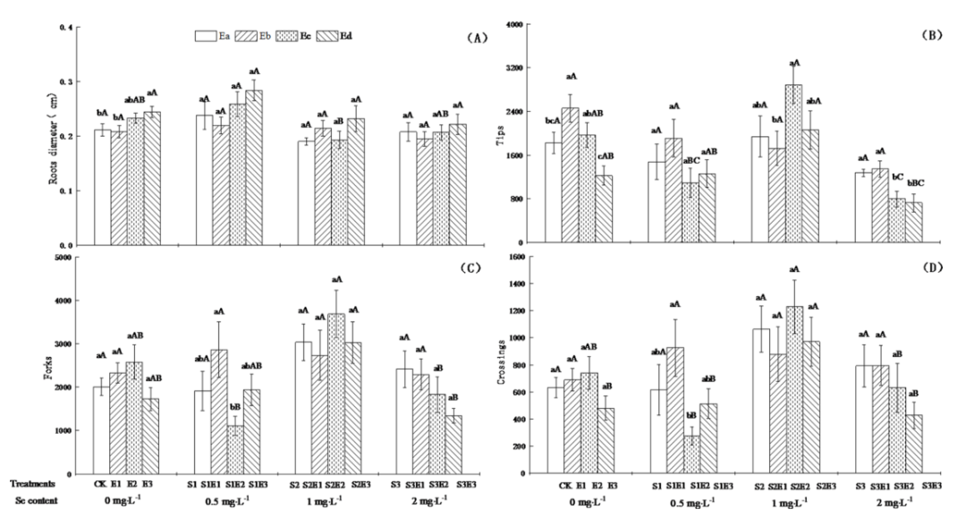 以速生小白菜为研究对象,开展其在EG16菌剂(一种PGPR)接种和外源硒添加等两因素4水平下的水培实验,小白菜在MS培养基生长21天后收获。结果表明,小白菜生长促进更多受到来自于PGPR而非硒的影响。二者协同作用时,较低浓度硒与PGPR组合(1 mg Se L−1 和7.65×107 CFU mL−1 EG16)能在一定程度上提高小白菜生物量,促进其根系生长,使得根尖数、根分支数等增多。与之相反,较高浓度硒与PGPR组合(2 mg Se L−1 和11.3×107 CFU mL−1 EG16)则会抑制小白菜生长。