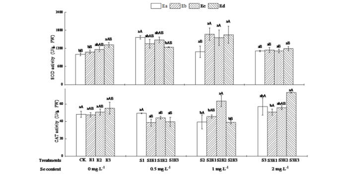 与植物生长类似,硒与PGPR单独或协同作用均会对小白菜抗氧化酶活性产生影响。在大多数情况下,抗氧化酶的活性随着PGPR浓度的升高而增大。在硒为0.5 mg L−1,外源硒对SOD和CAT的影响大于PGPR,随着硒浓度的升高,硒与PGPR协同作用对SOD和CAT的影响大于硒或PGPR单独作用。尤其是1 mg Se L−1和7.65×107 CFU mL−1 EG16组合下,小白菜抗氧化酶的活性更强。
