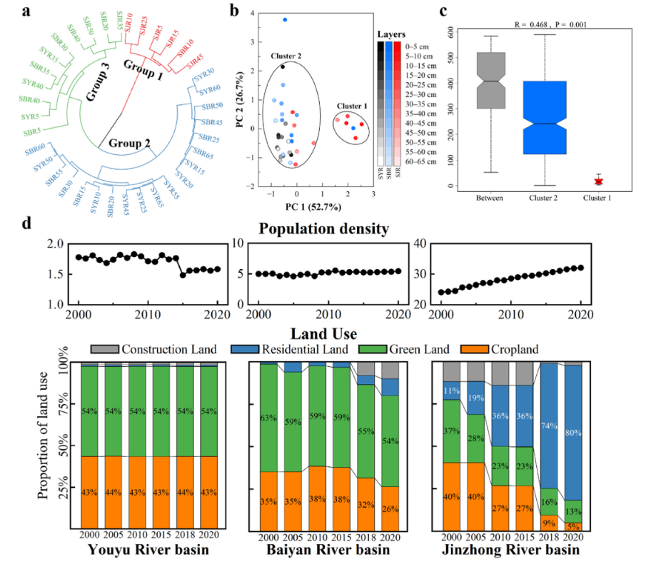 图4基于河口沉积物柱中微塑料形貌特征与聚合物类型的HCA分析(a)、PCA分析(b)、ANOSIM分析(c);2000-2020年阿哈湖主要入湖河流游鱼河、白岩河、金钟河流域人口及土地利用变化图(d)