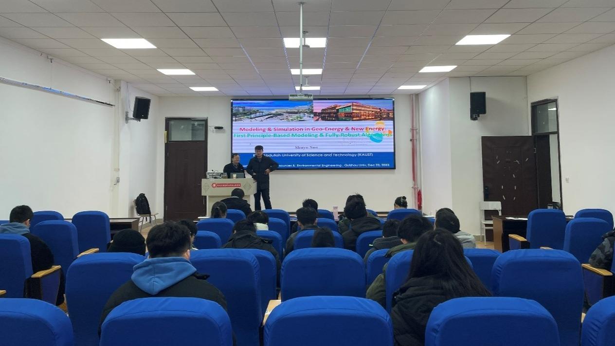 2023年12月22日,沙特阿卜杜拉国王科技大学(KAUST)孙树瑜教授,受邀来资源与环境工程学院&喀斯特重点实验室,进行了题为——地球能源和新能源的数值建模和仿真技术:基于第一原理的物理建模和高效稳定的数值算法的学术报告。报告会在资环楼521会议室举行,40余位资源与环境工程学院&喀斯特重点实验室师生参加。