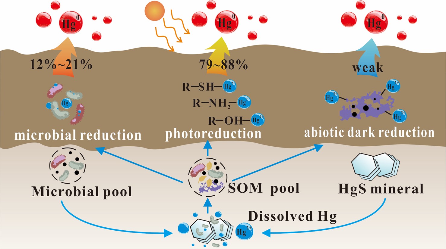汞(Hg)是一种持久性污染物,通过大气环流可以造成元素汞(Hg(0))的长距离传输,在全球范围内引发环境健康和生态风险问题。土壤Hg(0)排放是重要的大气汞排放源,在全球Hg的生物地球化学循环中起着至关重要的作用。光还原、微生物还原和非生物暗还原都可能导致土壤Hg(0)的排放,但不同还原路径的贡献尚不清晰。