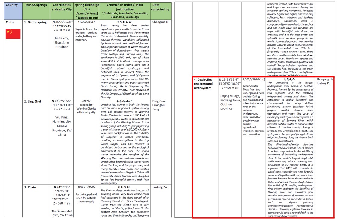 近日,从国际水文地质学家协会(International Association of Hydrogeologists,简称IAH)MIKAS项目网站获悉,贵州大小井地下河入选IAH全球最重要的岩溶含水层(泉)清单(网址:https://mikasproject.org/mikas-list/),该地下河的入选表明实验室研究受到国际水文地质同行的关注。中国目前仅4处岩溶含水层(泉)位列其中,包括山东济南趵突泉、广西南宁灵水泉(湖)、广西河池坡心地下河和贵州大小井,其中贵州大小井地下河是实验室何守阳副教授所承担的国家自然科学基金项目“岩溶地下河系统水化学对人类活动输入响应的时空分异(项目编号:42267014)”的野外科学研究观测点。该项目开展了地下河系统水位、水化学及环境同位素的长期观测,将利用地球化学、光谱技术和数据R可视化等综合手段揭示岩溶地下河系统水化学对人类活动输入响应的时空分异过程与机制,助力降低大小井岩溶地下河系统水水质风险和保障区域饮水安全。