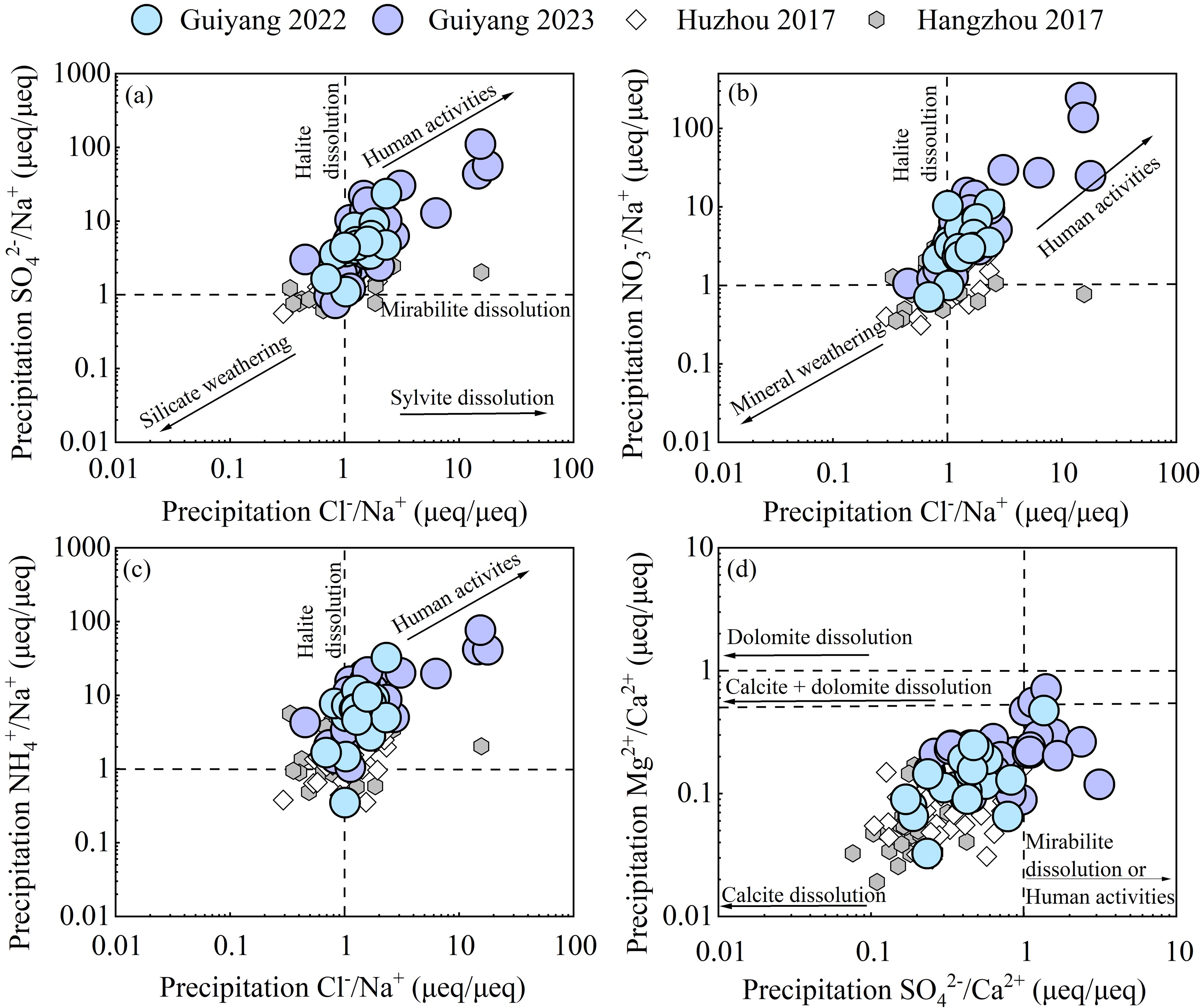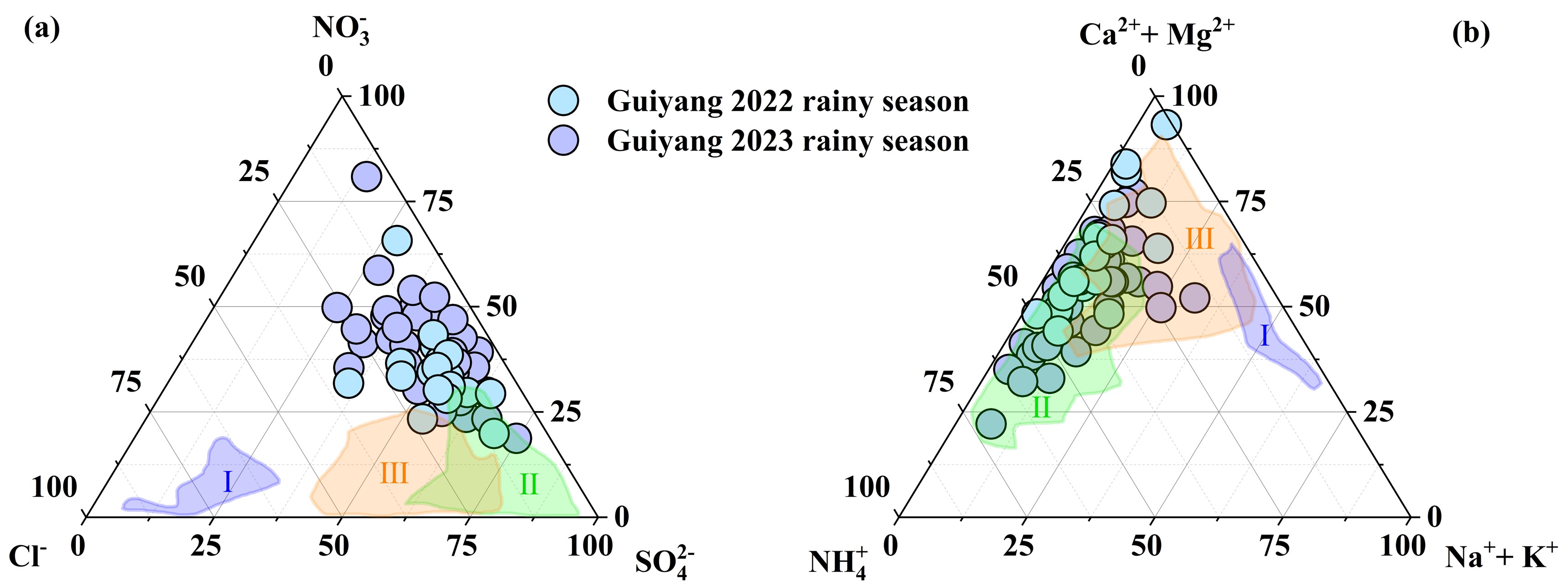 在此背景下,贵州大学喀斯特地质资源与环境教育部重点实验室曾杰特聘教授指导课题组本科生毛世骏,对我国西南典型喀斯特城市贵阳开展了两个雨季的降水阴阳离子和大气污染物研究,阐明了夏季多雨喀斯特城市地区降水化学污染物的变化及来源。取得的主要认识包括:(1)自然因素对雨水离子的影响主要源于降水量及其稀释效应,而人为影响则对降水离子产生不同程度作用,例如二氧化硫排放和空气PM2.5含量影响SO42-、NO3-和Ca2+,而烟尘和粉尘排放则影响SO42-和NO3-。(2)基于化学计量方法,多元统计分析方法和受体模型等识别并量化得出人为来源、海洋输入和大气尘埃/颗粒物分别贡献了总雨水离子浓度的34.3%、32.9%和32.8%,且人为排放是雨水SO42-(50.8%)和NO3-(68.6%)的主要贡献源,海洋输入则主导了Cl-(56.5%)和Na+(77.7%),而大气尘埃/颗粒物是降水中Mg2+和Ca2+的主要来源,分别贡献了43.7%和50.4%(图1和2)。(3)基于三角图和雨水化学成分的化学计量分析,有效地表征了降水过程对大气物质冲刷效应及降水化学组分的来源(图1和3)。