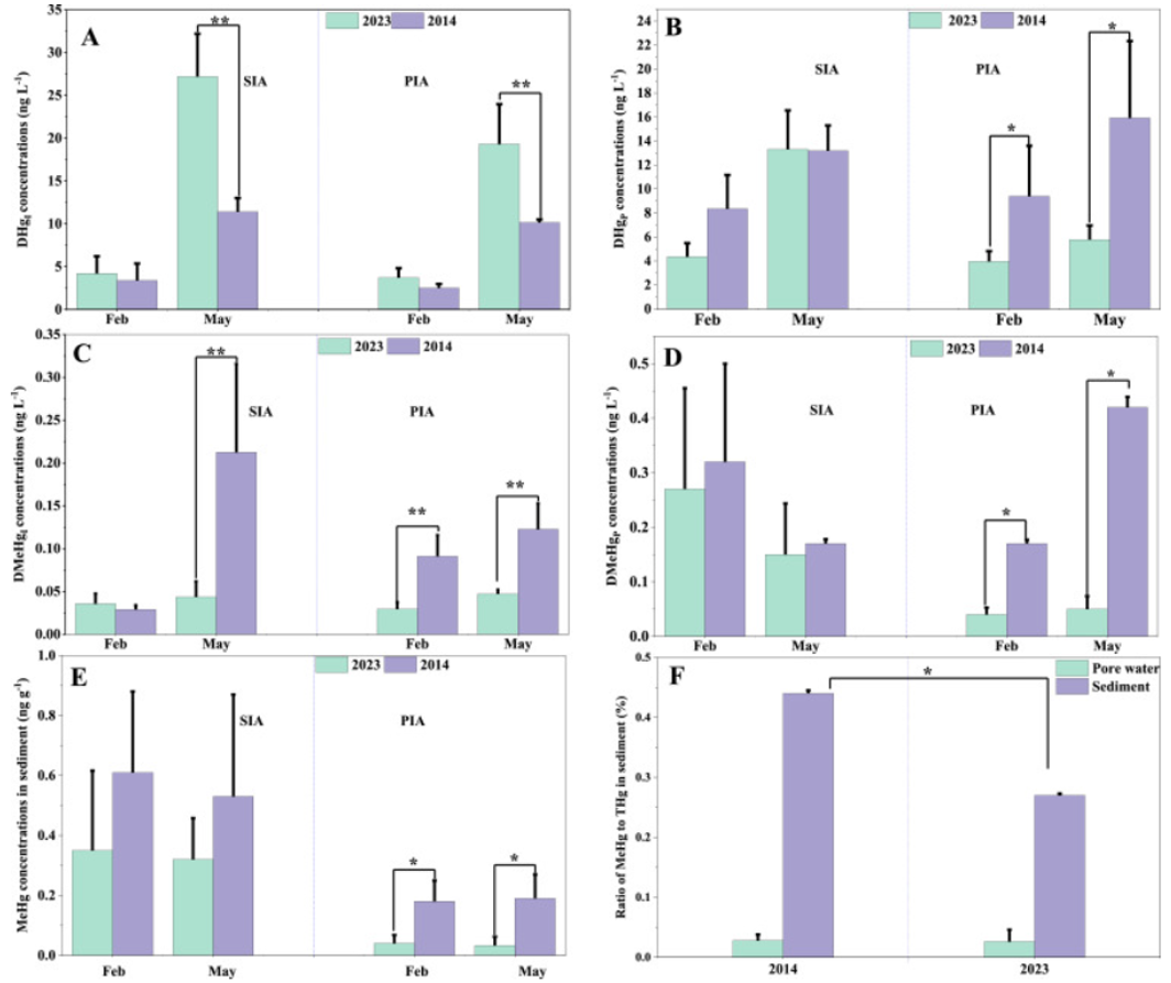 图4 沉水植物衰退前(2014)和衰退后(2023)界面水(A、C)和孔隙水(B、D)中DHg和DMeHg浓度,以及沉积物颗粒MeHg(E)和沉积颗粒物中MeHg与总汞的比值(F)变化