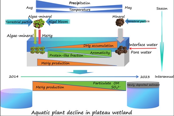 沉水植物衰退事件引起汞和甲基汞在水和沉积物中的积极响应。在空间方面,PIA表现出沉积物Hg的增加和MeHg的减少,以及孔隙水与界面水中DHg和DMeHg浓度的降低。在时间分布上面,5月份呈现出孔隙水和界面水中DHg的增加,而8月份则表现出DMeHg积累的增加,形成了时间上的错配分布。在10年尺度上,沉水植物衰退后,沉积物-水界面处的DHg显著增加,而空隙水和沉积物中的DHg和MeHg显著减少。沉水植物衰退事件的发生具有偶然性,也是不可预料的,但是它重塑了高原湿地沉积物Hg和MeHg的分布模式,本研究强调将这一事件在未来纳入到高原湿地Hg风险评估当中的必要性。