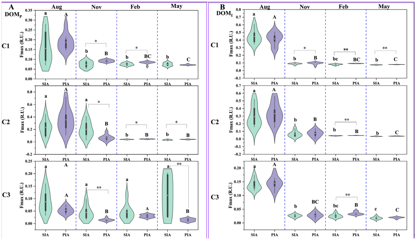 SIA-DOMP中的类腐殖组分低于PIA-DOMP(图2),这表明PIA-DOM较大比例的成分来源于浮游生物演化和陆地输入。相反,SIA-DOMP中藻源性蛋白质组分的荧光强度高于PIA-DOMP。此外,8月份沉积物界面水和孔隙水DOM具有显著高于其他时期的藻源性类蛋白质组分,这意味着积累了更多来自于藻类分解的类蛋白组分。