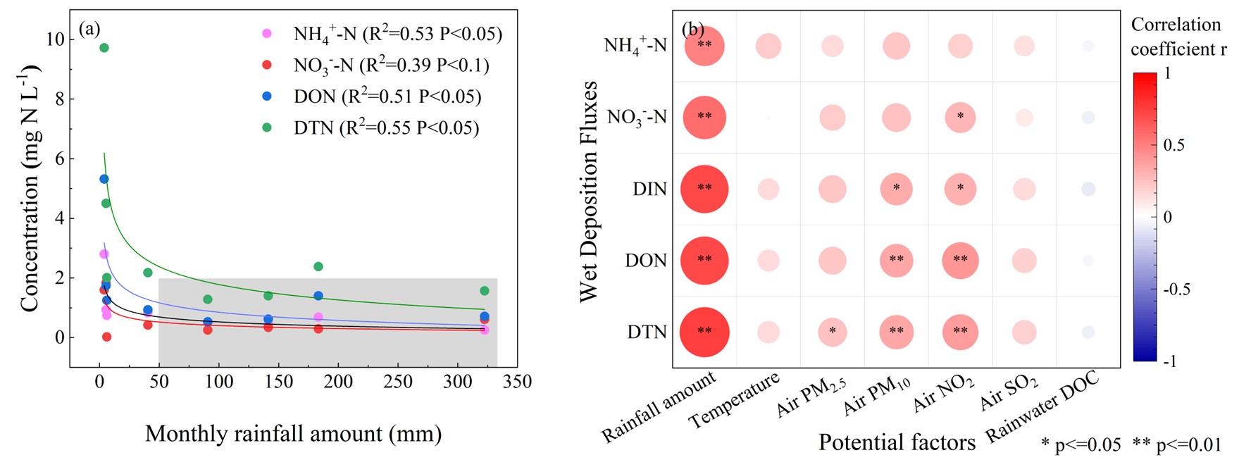 在过去的一个世纪里,与农业和工业相关的人类活动导致排放到大气中的含氮(N)污染物至少增加了一倍,而氮湿沉降(主要是降水)作为地球表面氮循环的重要组成部分之一,由于大气中含氮污染物的不断增加而逐渐提升,已经成为了全球关注的热点问题。此外,氮湿沉降不仅是陆地生态系统的潜在营养物质输入源,也是引发严重生态环境问题(如水体富营养化、生物多样性减少)的酸性物质的重要来源。中国西南地区正处于社会和经济的快速发展时期,区域工业发展、交通运输、农业活动等人为氮排放源不断增强,加上其独特的高海拔和特殊地形,最终导致了不可忽视的湿沉降氮污染。