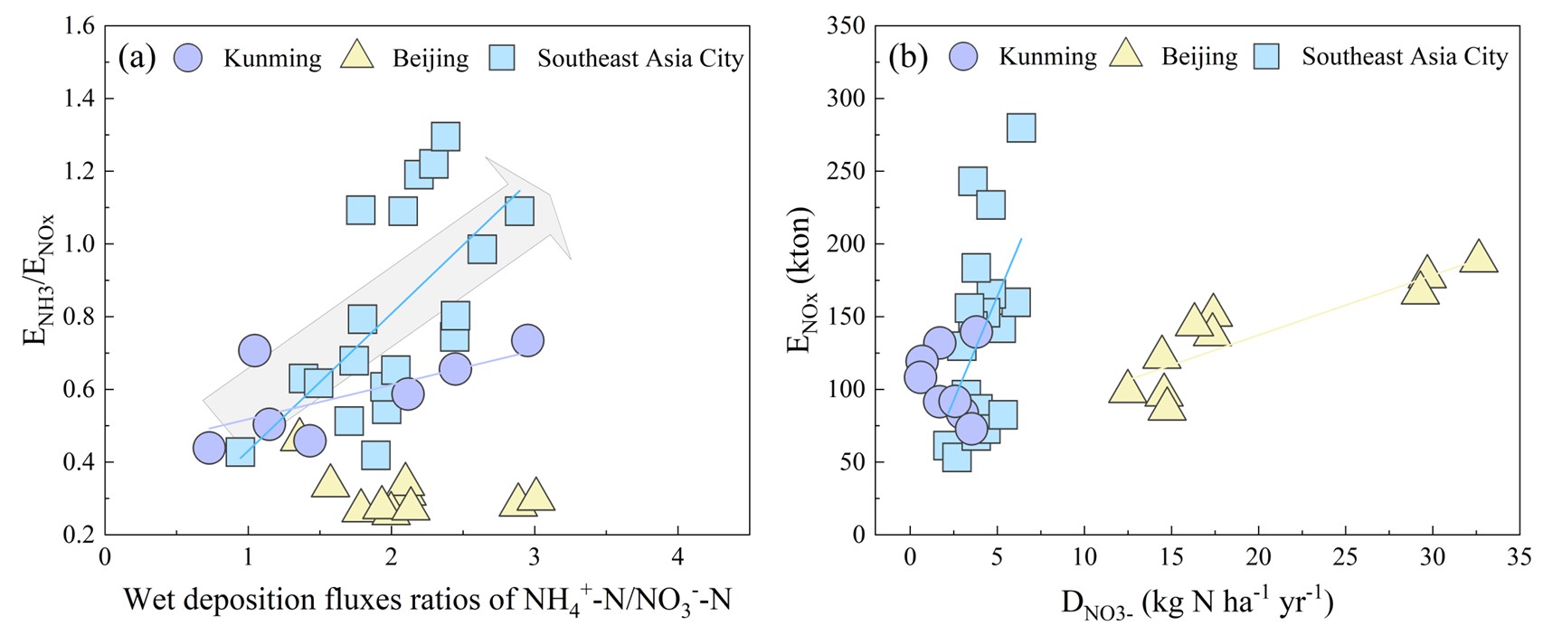在此背景下,贵州大学喀斯特地质资源与环境教育部重点实验室曾杰特聘教授指导课题组本科生刘子轩,对我国西南高原城市昆明开展了为期一年的氮湿沉降研究,阐明了高原城市热点地区雨水含氮污染物的现状、变化和来源。取得的主要认识有:(1)昆明市雨水中氨氮(NH4+-N)、硝氮(NO3--N)和溶解有机氮(DON)的含量分别为0.46、0.45和0.88 mg N L-1,溶解总氮(DTN)的沉降通量为14.20 kg N ha-1 yr-1,接近西南地区的平均水平,其中NH4+-N、NO3--N和DON分别占DTN沉降通量的26.0%、24.8%和49.2%。(2)氮浓度(11月最高,对应的降雨量最低)和氮湿沉降通量(8月最高,对应的降雨量最高)的显著变化反映了降水的强烈稀释效应,降雨量、大气污染物含量与氮湿沉降通量存在显著正相关性(图1)。(3)含氮组分与其他离子的化学计量特征表明,农业和非农业因素共同控制着区域尺度的氮湿沉降(图2),而昆明地区的历史大气含氮污染物排放数据与氮湿沉降通量的相关性则揭示了当地人类活动和跨界污染物是影响该高原城市氮湿沉降的主要因素(图3)。