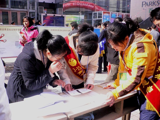 活动过程中,我院志愿者大量发送《中华人民共和国消费者权益保护法》、《贵州省消费者权益保护条例》和贵阳市消费者协会发行的《消费警示录》等刊物。不时有曾经受过骗或损失的消费者向志愿者诉说自己的受骗受害经历,并寻求救济途径。我院工作人员对他们的受害经历深表同情,对商家的欺诈行为表示深恶痛绝。同时,针对受害者的不同情况向他们提供不同的救济途径。其中,一名来自铜仁地区77岁的王老汉向工作人员投诉了在某商家购买家电的不良售后服务问题。志愿者热情地接待了这位老人,并向老人解释相关的法律规定,帮助老人找到解决问题的方法。老人对志愿者的服务态度和工作热情予以充分肯定和高度评价。
