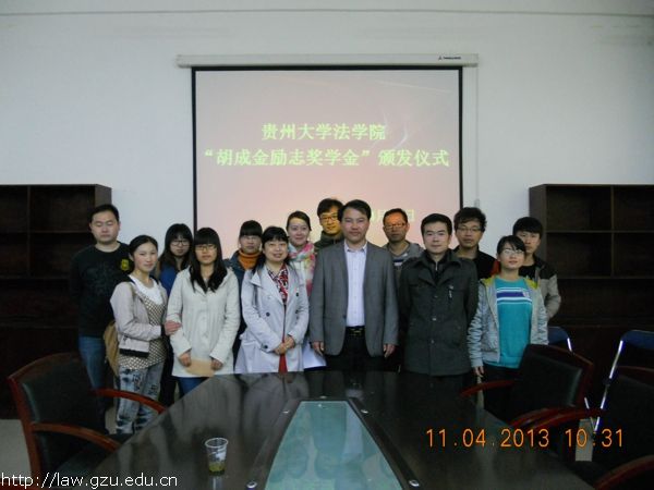 4月11日上午,法学院举办了“胡成金励志奖学金”颁发仪式,出席本次颁发仪式的有我院党委副书记唐飞虎老师、教学科研科黄梅老师、法学系主任刘爱军老师、法硕教育中心周欢老师以及奖学金创办人胡成金师兄。此外,法硕、本科各班班长、团支书以及受资助的同学参加了本次颁发仪式。会议由教学科研科黄梅老师主持。
