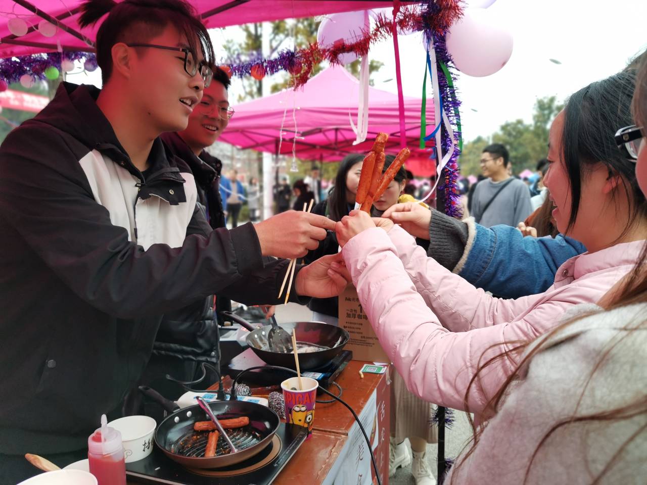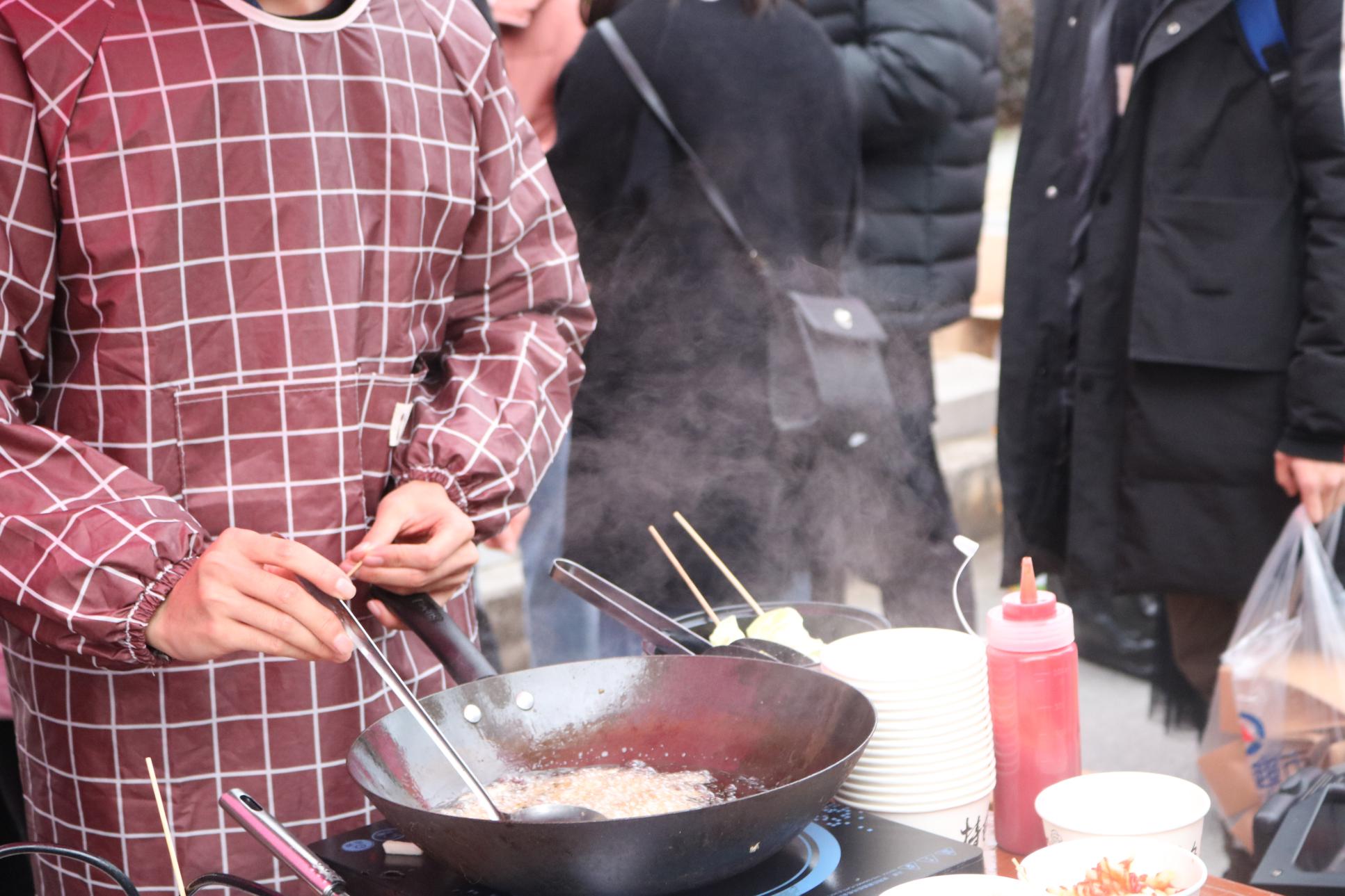 活动伊始,几位同学用话筒招呼顾客前来,负责准备食物的同学忙忙碌碌,但又洋溢着开心的笑容,不久法学院的场地前就排起了长队。活动进行中,辅导员王冰老师来到了活动现场,问候了正在工作的同学们,并且一起参与到食材准备的工作中,整个过程大家有说有笑,充分感受到了集体活动的乐趣所在。