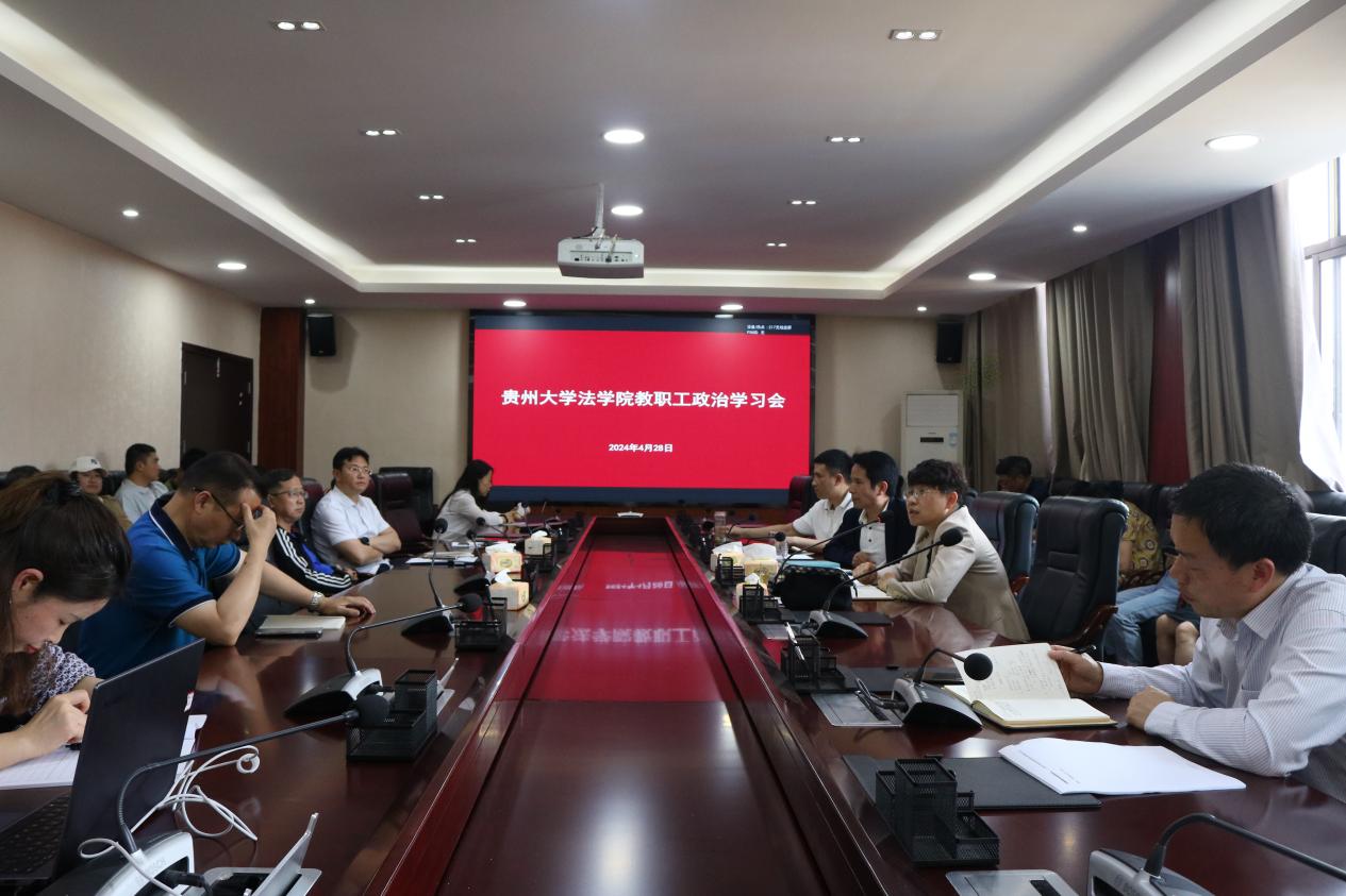 4月28日,贵州大学法学院在逸夫楼217会议室召开贵州大学院法学院教职工政治学习会,法学院党委书记石明昌,院长冷传莉,正处级组织员张亚军,副院长宁立标,副院长孙志煜出席会议,全院教职工参与会议,会议由法学院院长冷传莉主持。