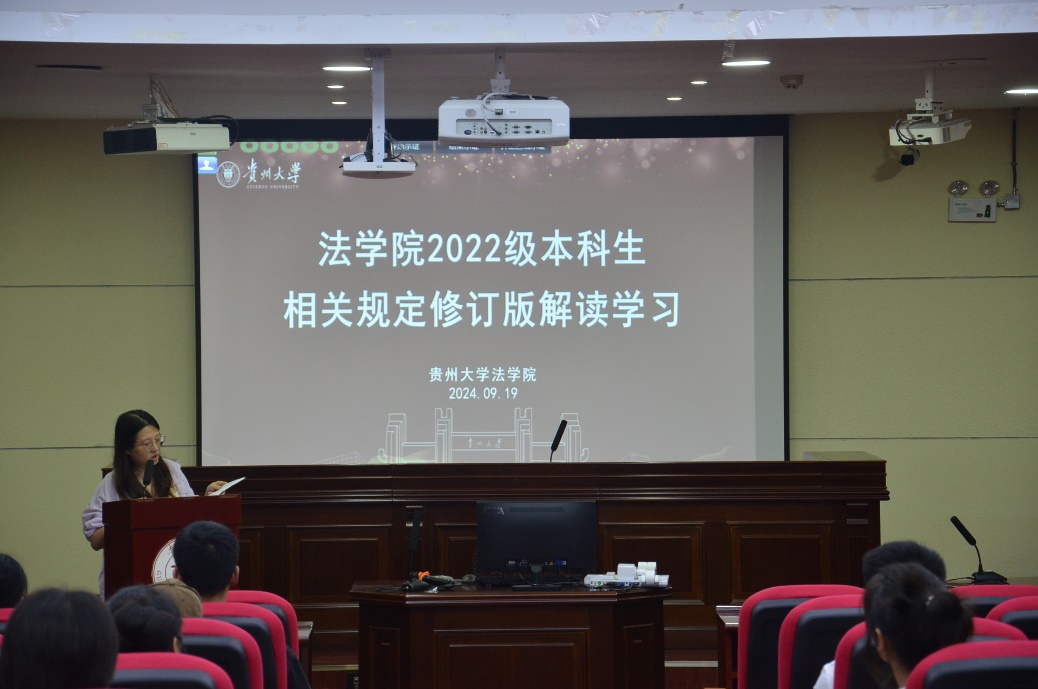 2024年9月19日下午,贵州大学法学院2022 级本科生年级大会在东校区慎思楼模拟法庭召开。法学院副院长孙志煜教授、学生科辅导员金鑫老师出席本次会议。