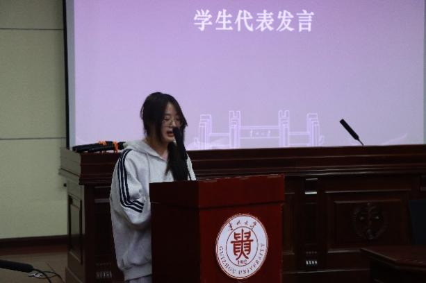 表彰结束后,2022级宋浩弘、2023级曾利琴作为学生代表发言。宋浩弘同学分享了自己参与学院体质提升行动的真实感受,以及运动给自身带来的明显改变。曾利琴同学讲述了自己从“被迫运动”到“主动奔跑”,从尝试开始到逐渐坚持并最终收获的过程,并期待同学们在运动中遇见更好的自己。